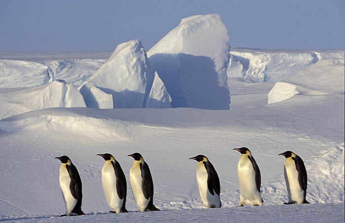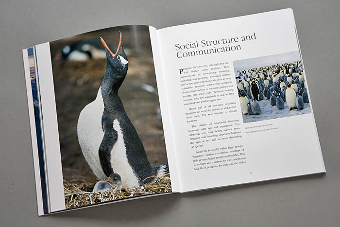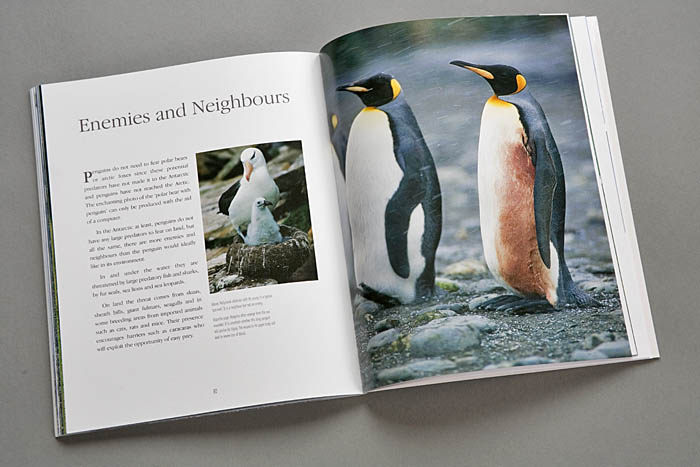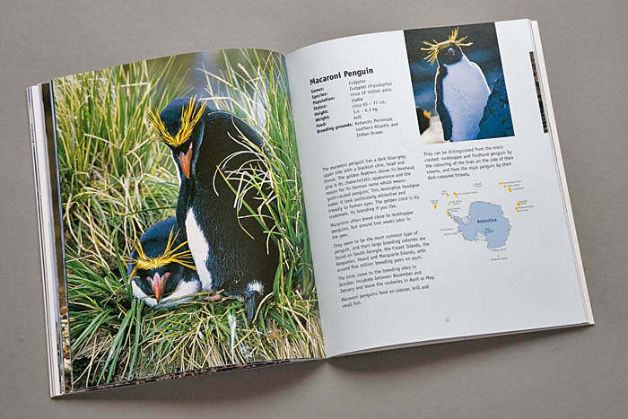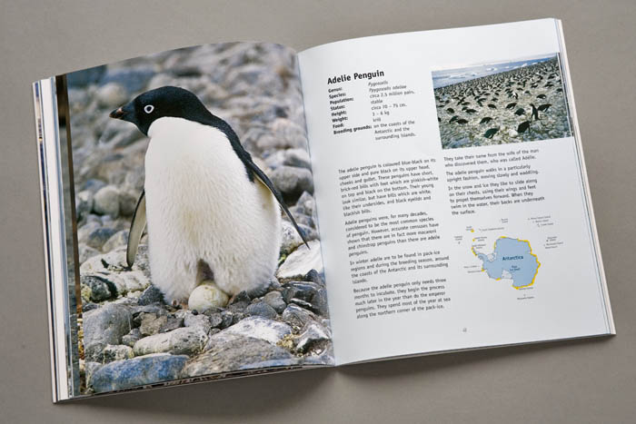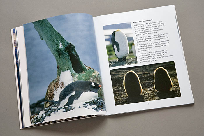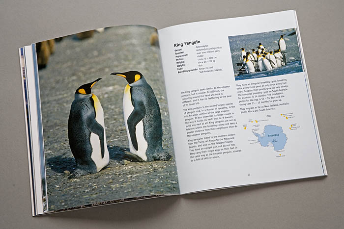 There are seventeen different species of penguins in the world all of which live by or near the sea. Most live on the coast of Antarctica and some in warmer places on the coast of South America, Africa, Australia and New Zealand. Although each species is slightly different they cannot fly as their wings are adapted for life in the water. The Emperor penguins are the largest of the species at about a metre tall and weighing 35 kilograms. The smallest are the Little Blue or Fairy penguins at around 40 centimetres, weighing as little as 1 kilogram. They have a lifespan of up to fifteen years with the largest species living up to twenty five years. Penguins are sociable creatures spending much of their time together with other members of the same species forming colonies to breed in what is known as rookeries. Colonies vary in size and can have from 500 to 50,000 penguins in them. Penguins face many dangers while at sea from ocean predators like leopard seals, sea lions, sharks and killer whales who eat them für food, and on land rodents, foxes and birds steal their eggs. In the past there were more species of penguins and today some are endangered. Apart from natural predators, humans are equally responsible for the decline in some species and conservation groups are working protect them. Fritz Pölking has spent much time in Antarctica and in the book he illustrates with wonderful photographs the various species and their habitat. |