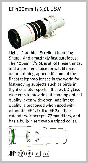 Nun - wenn man den Faktor 1.6x dieser Kameras berücksichtigt und den Faktor, dass man ja statt einer analogen Kamera mit einem Sensia-100, jetzt eine digitale SLR hat, die man ruhig auf 200 ISO einstellen kann bei mindestens gleicher Qualität, dann - ja dann ist diese Utopie durchaus realisierbar. Es gibt eine ganz fantastische Canon-Festbrennweite mit 5.6/400 mm, mit AFund für Konverterbetrieb mit den 1.4x und 2x Canon-Konvertern bestens geeignet. Wie weit man mit Konverter noch AF benutzen kann, liegt an der Kamera. Es gibt welche die arbeiten nur bis Blende 5.6 mit AF (30D und 5D), welche bis 8.0 und sogar bis 11.0 (D1-Reihe). Es liegt auch z.T. am Motivkontrast und der Helligkeit. Canon-Amsterdam importiert dieses Objektiv nicht aus Japan für den deutschen Markt, aber Canon-USA, Canon-Canada und Canon-Mexicana bieten es für die Naturfotografen in ihren Ländern an, und daher kann man es auf dem neuen Kontinent überall bekommen. Hier die Abbildung aus dem neuesten Canon-Katalog für Amerika vom Februar 2005.