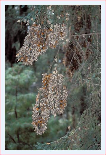 Monarchschmetterlinge Bis 1970 wußte man nicht, wo die 100 Millionen Monarch-Schmetterlinge aus Nordamerika überwinterten. Dann entdeckte man sie in 3000 Meter Höhe in Mexikos Hochgebirge in riesigen Klumpen an den Bäumen hängend. Die Farmer gingen früher mit Flammenwerfern gegen sie vor, weil man die Schmetterlinge für eine Gefahr für die Bergwälder hielt, etwa wie bei uns die Borkenkäfer. Heute sind die Winterquartiere dieser Schmetterlinge geschützt und werden jährlich von vielen tausend Besuchern bestaunt. 25 - 40 Millionen der Falter sterben im Winterquartier, und der Boden unter den Kolonien in den Bäumen ist bedeckt von toten und sterbenden Tieren. Dieses Bild entstand im Reservat Sierra Cincua, bei Angangeo in der Provinz Michoacan.