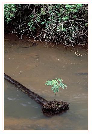 Ebenen in der Naturfotografie Man kann ein Naturfotos einfach als Abbild machen, als Ergebnis der Kamerajagd, als Dokument. Wenn Bilder erfolgreich sein sollen, müssen sie gewöhnlich auf einer höheren Ebene angesiedelt werden. Sie sollten natürlich technisch einwandfrei sein und sauber gestaltet nach den bekannten Kriterien wie Goldener Schnitt oder das System der Dreiteilung. Aber das alles genügt nicht, um das Interesse des Betrachters zu wecken, ihn emotional zu erreichen und zu berühren. Ein Bild muss den Betrachter anrühren, zum Nachdenken bringen oder ihn überraschen. Daher ist der Naturfotograf immer auf der Suche nach Motiven, die den Betrachter aus seiner 'Abwehrhaltung' der Reizüberflutung gegenüber herausholen, sei es durch ein nie vorher gesehenes Motiv, durch ein besonders starke Emotionen auslösendes Motiv oder durch etwas Besonderes. Im Januar dieses Jahres wanderte ich über einen mehrere Kilometer langen Steg im argentinischen Iguazu Nationalpark, als der Steg einen Fluss überquerte und ich dieses Motiv sah: Ein junger Baum, der mitten im Fluß aus einem toten herauswuchs, und ihn als Halt, Wurzel und Lebensquelle benutze. Neues Leben erwächst aus altem und abgestorbenem - ein starkes Motiv, Bild und Sinnbild. Zuerst fotografierte ich es mit längeren Brennweiten von 300 mm und 400 mm, war aber nicht zufrieden mit dem Ergebnis (siehe Portfolio 'Iguazu und Regenwald'). Es zeigte dem Betrachter nicht auf einen Blick, was hier geschah. Schließlich nahm ich das 4.0/70-200 mm Zoom und setze die 'dramatische' Szene, wie ein junger Baum den alten, toten als Basis für sein - wie lange währendes? - jungen Leben benutzte, so im Hochformat in Szene, das man sich gleich auf einen Blick vorstellen kann, wo sich dieses stille Drama abspielte, und wie es wohl enden wird im immerwährenden Kampf um Leben und Überleben.