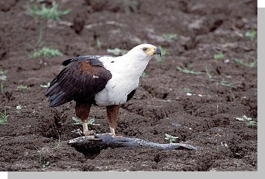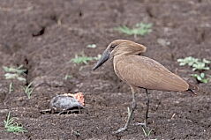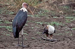 Gegengeschäfte.. Wenn die Regenzeit im Musiara-Sumpf in Kenias Masai Mara Wildreservat zu Ende geht, und die große Trockenzeit beginnt, müssen die Fische aufpassen und eine tiefe Wasserstelle finden, wenn sie überleben wollen. Eine Gruppe von etwa 30 Welsen hatte dies verpaßt, und war in einer kleinen Wasserlache gefangen, die von Tag zu Tag mehr austrocknete. Fast immer wenn ich die Stelle kontrollierte, standen dort 4 - 6 Marabus und 1 -2 Schreiseeadler (African Fish Eagle) um den Tümpel herum. Die Marabus konnten die Fische nicht herunterschlucken, dafür waren sie wohl zu groß. Aufspießen und öffnen konnten sie die Welse anscheinend auch nicht. So wiederholte sich manchmal folgender Vorgang: Die Marabus "machten mit einem Wels so lange herum", bis er tot war. Dann zogen sie ihn an Land, wo sie sich ihn "widerstandslos" von einem Adler abnehmen ließen. Der öffnete den Fisch und fraß ihn zum großen Teil, bevor er abflog. Dann kam erst ein Hammerkopf, der die Fischstückchen im Umkreis von 20 - 30 cm aufpickte, die dem Adler von der Beute weggespritzt waren, wenn er am Fisch gezogen hatte, um Teile aus der Beute herauszureißen. Danach kam dann vorsichtig der Marabu zurück, und der Kreis war geschlossen. |