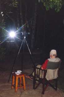 Buschbabys Buschbabys - die unendliche Geschichte Im Mara River Camp ist am Waldrand in etwa 1,5 m Höhe ein Brett befestigt, auf das kurz vor der Abenddämmerung immer einige aufgeschnittene Früchte für die nachtaktiven Buschbabys gelegt werden. Meistens kommen auch 1 - 4 Exemplare in der ersten Stunde der Dunkelheit, um sich an diesem mit einer Lampe angestrahlten Platz das Abendessen abzuholen. Eine gute Gelegenheit also, einige Fotos dieser nachtaktiven Primaten zu machen. Die auf den ersten beiden Touren gemachten Bilder waren entäuschend ausgefallen - ein dunkler Riesengalago vor einem dunklen Hintergrund sieht nicht besonders gut aus. Auf den nächsten beiden Touren hatte ich keine Zeit, weil ich immer von den Leopardenfahrten viel zu spät ins Camp zurückkam. Dann hatten die kleinen Primaten schon immer alles aufgefressen. Auf der fünften Tour wollte ich es nun besser machen: Zum normalen SB-24 Blitz von Nikon nahm ich noch den starken Metz 45B mit Televorsatz mit, um ihn hinter das Motiv placiert als Gegenlicht einzusetzen. Mit einer Fotozelle versehen löste der Metz-Blitz immer automatisch mit aus, wenn ich mit dem SB-24 an der Kamera eine Aufnahme machte, und umgab das Tier dann mit einem Lichtsaum, der es sich deutlich vom Hintergrund abheben ließ Leider klappte es auch diesmal nicht: Die TTL-Messung des Führungsblitzes reagierte immer unterschiedlich, je nachdem, wie das Buschbaby saß und wie das Gegenlicht durchkam. Der Hauptblitz gab also mal zuviel und mal zuwenig Licht ab. Auch hatte ich den rückwärtigen AufheIl-Gegenlichtblitz zu nahe positioniert, so daß der Effekt zu stark wurde, und das Buschbaby aussah, wie von einem Heiligenschein umgeben. Also machte ich zuhause vor der 6. Tour einige Versuche, wie weit der Metzblitz vom Tier entfernt sein muß, damit es im Bild gut und natürlich aussieht. Außerdem machte ich auch noch einige Proben mit dem Führungsblitz SB-24, mit ausgeschalteter TTL-Messung, also mit Stellung auf M für manuell, wo er ja nicht durch das Fremdlicht des Zweitblitzes irritiert werden kann. Es war also jetzt alles vorbereitet, um auf der 6. Tour endlich die perfekten Bilder der Buschbabys zu machen, aber - inzwischen war die Mara grün, die Bäume waren in vollem Saft, und die Tiere an der Zusatznahrung durch die Lodge anscheinend zur Zeit nicht interessiert. Ich werde also mit den Bildern bis zur Trockenzeit warten müssen, bis die Buschbabys dann wieder regeImäßig zur Fütterung kommen. Es zeigte sich auch hier wieder, daß man gute Aufnahmen nicht immer 'mal so eben' machen kann, sondern daß sie oft mühsam erarbeitet sein wollen. (Masai Mara, Seite 55 und Naturfotografie, Seite 46). 12. Mai 1994. Während es mit den Bildern für das Leopardenbuch im Augenblick schlecht aussieht, ergeben sich für das Marabuch überraschend erfreuliche Perspektiven. Schon seit Monaten hatte ich darüber nachgedacht, wie ich am besten Luftaufnahmen vom Gebiet machen kann. Mit dem Ballon war nicht so toll, weil der nur in eine Richtung flog. Ein Flugzeug war auch nicht ideal, wegen der Scheiben und der Geschwindigkeit. Jetzt plötzlich eröffnete sich eine großartige Möglichkeit: Im Fig -Tree -Camp war ein Franzose, der ein sogenanntes Ultraleicht-Flugzeug hatte, also einen Hängegleiter oder Drachen mit einem angeschraubten Rasenmähermotor . Das war ideal: der flog sehr langsam, und man saß völlig im Freien - unter sich nur ein suppenteIlergroßer Sitz, und rundherum gar nichts, also ausgezeichnete Fotobedingungen. Gestern haben wir den ersten Probeflug von einer Stunde Dauer über die Masai Mara gemacht. 'Microlight' zu fliegen ist ein Riesenspaß, und ergibt einen fantastischen Blick auf die Landschaft. Ich habe auch gleich die Leopardenschlucht und die Feigenbaumallee für das Leopardenbuch mitfotografiert. Heute morgen sind wir wieder geflogen, diesmal gleich drei Stunden, und haben aus der Luft große Teile der Mara 'abgeklappert'. Vor allem die Bilder vom Mara-Fluß scheinen schön zu werden. Von oben sieht der Fluß aus, als würde er sich winden wie eine Riesenschlange.(Masai Mara, Seiten 16 und 56/57).