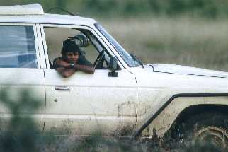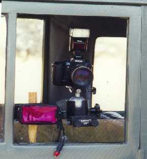 Viele Spiegelreflex-Kameras haben heute Autofokus und/oder eine elektronische Einstellhilfe. Diese arbeitet so, daß bei hundertprozentig korrekter Scharfeinstellung im Suchereinblick ein grüner oder schwarzer Punkt erscheint und signalisiert, daß jetzt die Schärfe absolut richtig eingestellt ist. Diese beiden technischen Hilfsmittel sind für mich unbezahlbar wichtig bei Nachtaufnahmen; denn ich kann zwar im Scheinwerfer oder Taschenlampenlicht das Motiv erkennen, aber es ist mir völlig unmöglich, manuell bei diesem 'Restlicht' korrekt zu fokussieren. Erschwerend kommt noch hinzu, daß man kein weißes Einstellicht nehmen sollte, weil dies die Tiere oft irritiert, sondern besser Rotlicht, weil sie darauf meistens nicht reagieren. Aber auf Rotlicht einzustellen, ist noch schwieriger. Weil ich mit dem Lichtstrahl von Taschenlampen als Einstellhilfe nicht sonderlich zufrieden war - auch nicht mit den starken Stablampen, die angeblich bis 1.000 rn reichen - kaufte ich bei Kettner für DM 39,50 eine Lampe für Jäger, die man am Zigarettenanzünder des Autos anschließen kann, und beklebte sie mit einer roten Folie. Das Ergebnis war großartig: auf 20 -30 rn Entfernung kann man damit draußen bei Dunkelheit sogar noch mit Autofokus arbeiten, und die Fotografie von Afrikas Tierwelt in der Dunkelheit wurde zu einem reinen Vergnügen. Hier auf dem Bild sieht man meine Ausrüstung für die Arbeit in der Dunkelheit: Auf der Kamera ein SB-24 Blitz, der bei Reflektorstellung auf 85 mm und einem 200 ISO-Film bis etwa 15-20 m reicht, je nach Objekthelligkeit und Blende (bei Blende 5,6 10 rn, bei B. 4.0 15 rn und bei 2,8 bis etwa 20 rn). Diesen relativ schwachen Blitz nehme ich, weil er die Ausrüstung nicht sonderlich belastet, und auch keine besonderen Umbauten im Fahrzeug erforderlich macht. Wenn man gezielt sich auf Nachtfotos spezialisiert, ist sicher ein stärkerer Metz Stabblitz zu empfehlen. Links neben der Kamera sieht man den mit roter Folie beklebten Scheinwerfer. Es ist für mich immer wieder faszinierend zu beobachten, wie schnell und exakt Autofokus in der Dunkelheit bei einem kleinen bißchen rotem Licht noch scharfstellt, wo ich schon faßt Mühe habe, daß Objekt der Begierde überhaupt im dunklen Sucher noch zu finden.