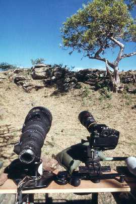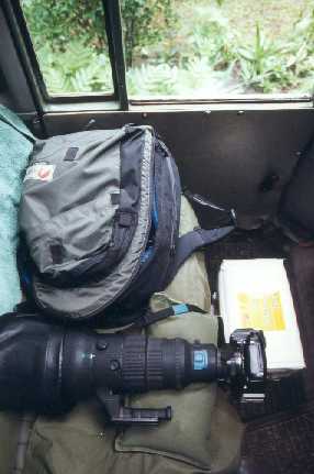 Während der verschiedenen Touren habe ich natürlich auch mit der Ausrüstung herumexperimentiert, um sIe möglichst optimal zu gestalten. Zweimal habe ich auch den großen Lowepro Supertrecker mitgenommen, was sich aber nicht bewährte aus dem einfachen Grund, weil es mir keinen Spaß machte, mit dem Riesending zu arbeiten. Für mich als optimal hat sich die folgende Ausrüstung herausgestellt: Neben mir auf dem Sitz schußfertig die lange Brennweite mit der Kamera dahinter und einem Sandsack darunter, damit sie besser liegt und nicht vom Sitz rutscht. Daneben der Rucksack mit ebensfalls schußfertig kombiniert das 300er mit dem zweiten Kameragehäuse. Auf dem Boden die Kodak Kühltasche mit den Filmen und in der Tür das Scheibenstativ mit einem großen Lumpp-Kugelkopf, abgestützt auf einem kräftigen Einbeinstativ. Ein zweiter Sandsack liegt für schnelle 'Notschüsse' aus der Dachluke bereit.