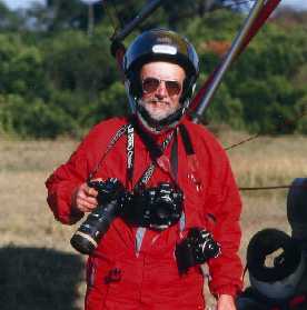 Das ist ein lustiges Bild und sieht mehr nach rasendem Fotoreporter aus als nach einem Naturfotografen. Tom Brakefield fotografierte mich hier vor meinem Start mit dem Ultraleicht. Der seriöse Hintergrund ist, daß man in der Luft besser keine Filme wechselt, weil direkt hinter dem Rücken sich der Propeller des Rasenmähermotors dreht, und wenn beim Filmwechsel durch die starke Luftströmung da oben einmal eine Filmdose davonfliegt in den Propeller hinein, dann ist das nicht unbedingt sehr komisch. Um also nicht alle zehn Minuten landen zu müssen ist es ratsam, sich einige Kameras umzuhängen. Diese hier sind mit den Brennweiten 2,8/24 mm, 2,8/55 mm und 2,8/70-210 mm bestückt. Mit dieser Kombination habe ich am Himmel über der Masai Mara die besten Erfahrungen gemacht: 24 mm für die weite Übersicht, 55 mm für die meisten und besten Landschaftsfotos aus der Luft, und 70 -210 rnm für Tieraufnahmen. Dazu offene Blende und Zeitautomatik, damit die Kamera immer die kürzest mögliche Verschlußzeit nimmt. Für Luftaufnahmen ist das Ultraleicht fantastisch geeignet, weil es recht langsam fliegt, und man keine Glasscheibe zwischen Kamera und Motiv hat.