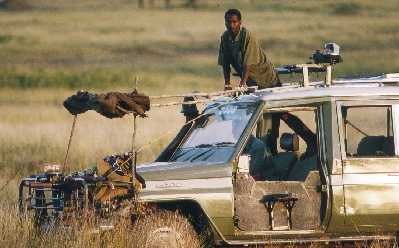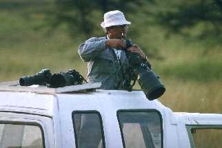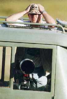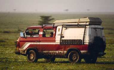 Man trifft im Laufe der Zeit viele interessante Kollegen in der Masai Mara. Hier ist es der französische Naturfotograf Michel Denis-Hulot. Er verbringt regelmäßig 6 Monate im Jahr in Ostafrika und lebt dann in diesem allradgetriebenen Volkswagenbus. Oben auf dem Dach hat er permanent ein Zelt installiert, das er abends nur aufklappen muß. Da oben in einem Zelt ist es nachts angenehmer als im Auto, und er kann den Platz im Wagen permanent anderweitig benutzen, den er sonst für Bettzeug und Gestell reservieren müßte.