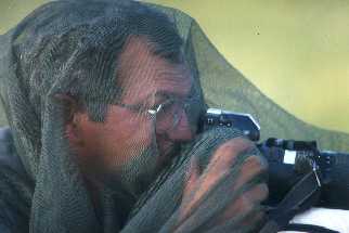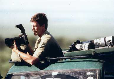 Der Naturfotograf Jean-Paul Ferrero aus Australien, der auch regelmäßig im Mara-River Camp anzutreffen ist. Weil er Moskitos haßt, benutzt er oft ein Schutznetz oder schlägt sie tot. Unsere Hinweise, daß man in einem Naturreservat keine Tiere töten darf, können ihn nicht beeindrucken.