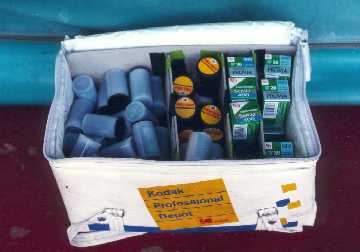 So eine Kodak Filmkühltasche steht bei mir im Wagen immer auf dem Boden neben meinem Sitz. Links die Fujichrome Sensia-100 Filme für - fast - alle Aufnahmen. In der Mitte die roten Kodachrome-200, für die 'blauen Stunden' ganz früh und ganz spät. Da der K-200 einen Braunstich hat, ist er sehr gut geeignet, eine zu blaue Farbbalance - etwa vor Sonnenaufgang oder bei Regenwetter - auszugleichen. Daneben ganz rechts die Fujichrome-4oo Diafilme, für lichtmäßig hoffnungslose Fälle. 400er Diafilme sind farblich katastrophal schlecht, und man sollte sie nur in alleräußersten Notfällen nehmen. * * *