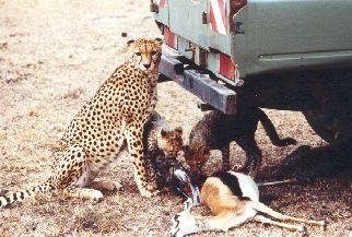 I. Tour 29. September - 19. Oktober 1993 Eigentlich wollte ich erst Mitte Oktober mit der praktischen Arbeit beginnen, aber weil am 20. September ein Anruf aus Nairobi kam, 'meine' Leopardin mit dem kurzen Schwanz sei wieder mit ihrem Jungen aufgetaucht, flog ich also kurzentschlossen etwas eher. Diese Leopardin hatte ich nämlich im Januar mit dem bekannten Kollegen Norbert Rosing zusammen ausgiebig fotografiert, als das Kleine etwa 3 Monate alt war. Zu gerne würde ich den kleinen Leoparden wiedersehen, jetzt, wo er über ein halbes Jahr älter war. In den ersten beiden Tagen war die Leopardin nicht zu finden. Vielleicht hatte sie das Gebiet schon wieder verlassen, um eine Wasserstelle zu finden, denn es war im Augenblick extrem trocken in der Mara. Im April hatte ich die beiden schon einmal zwei Wochen lang intensiv gesucht, ohne sie auch nur einmal zu entdecken. Ich wollte zu gerne den weiteren Lebensweg des kleinen Leoparden fotografisch dokumentieren, aber es sollte anscheinend nicht sein... Dafür trafen wir heute morgen eine Gepardin mit drei kleinen Jungen. Sie erbeutete eine trächtige Thomsongazelle, und wollte die Beute in den Schatten unseres etwa dreißig Meter entfernt stehenden Wagen ziehen. Da ich von der Idee der Gepardin nicht so begeistert war, fuhren wir das Auto ein Stück fort. Sie ließ sich aber nicht abschütteln, und zog die Beute wieder in Richtung Auto. Da ich nicht wollte, daß die Gepardin nun ihre Beute durch die halbe Savanne ziehen mußte, blieben wir also stehen, und sie verschwand mit der Beute und ihren drei Kindern unter unserem Fahrzeug - aus war es mit der fotografischen Dokumentation des Lebens der wilden Tiere in Afrika. Durch den Wagenboden dringt leider keine Kamera. Nach einer halben Stunde kamen dann zum Glück zwei Holländer mit einem Landrover, fuhren ganz dicht an unseren Wagen, und ich konnte durch die Fenster in das andere Auto umsteigen. So gelangen mir dann doch noch einige Aufnahmen der Geparde unter unserem Fahrzeug, nachdem wir etwas Abstand zwischen die beiden Autos gebracht hatten.
