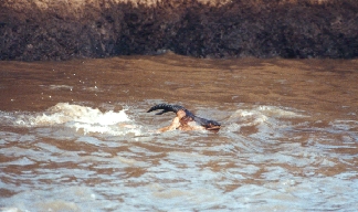 Was tun? Diesmal entschied ich mich für den Fluß, und es wurde ein halber Erfolg. Gegen 9.00 Uhr kreuzten etwa 1.000 Gnus und einige Topis den Fluß, wobei ich einige hübsche Fotos der Gnuherde machen konnte. Der Krokodilkampf war leider ein fotografischere Mißerfolg. Das Krokodil Tripod machte es sich diesmal sehr bequem: Es zog einfach mitten im Fluß ein Topi an einem Hinterbein nach unten und hielt es unter Wasser fest, bis es nach 10 Minuten ertrunken war. Nichts sichtbar dramatisches für die Kamera passierte - nur der Kopf des Topi tauchte immer wieder auf, wenn es versuchte Luft zu bekommen und zu entfliehen. Aber es hatte keine Chance: Stativ hielt es einfach am Bein fest - mehr brauchte das Krokodil nicht zu tun, was es auch ganz offensichtlich wußte. Das war zwar höchst effektiv und ökonomisch für das Krokodil, aber leider nicht sehr fotogen für die Kamera.