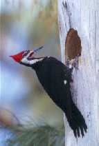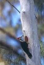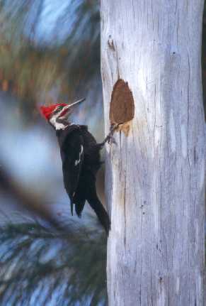 Mitte April 2000 hatte der Helmspecht Junge in seiner Höhle - etwa acht Meter hoch in einer Australischen Kiefer. Diese stand ziemlich direkt neben einer Straße auf der Insel Sanibel in Südwest-Florida. Also konnte ich Fotos nur von der anderen Straßenseite aus machen, und von dort zeigte die Entfernungseinstellung am Objektiv exakt 20 Meter an.