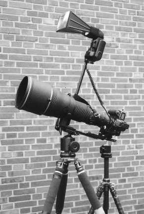 Standpunkt und Brennweite waren also jetzt festgelegt, aber wie war es mit der Lichtführung? Die Sonne stand hier den ganzen Tag über ziemlich steil, und es gab keinen Zeitpunkt mit idealem Licht für einen schönen Lichtpunkt im Auge. Also setzte ich den SB-24 Nikon-Elektronenblitz auf die Kamera, stellte den Blitzwinkel auf 85 mm, die Blitzstärke auf -1.7 Blenden Unterbelichtung, und machte den FX-1 Televorsatz vor den Elektronenblitz, der den Winkel eines 300 mm Objektives ausleuchtet und die Blitzreichweite um etwa 2 Blendenstufen verlängert. Dann stellte ich noch den Auslösezeitpunkt des Blitzes auf den zweiten Verschlußvorhang ein, damit der 'Lichtpunkt-ins-Auge-Aufhellblitz' die eigentliche Belichtungszeit nicht sehr beeinflussen konnte.