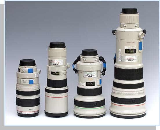 Was tun sprach Zeus... Von links: 4.5-5.6/100-400 mm, 5,6/400 mm, 4.0/400 mm, 4.0/500 mm oder für die Mark II (intern in meiner Spezifikation) ca: 3.5-4.0/130-500 mm, 4.0/500 mm, 2.8/500 mm und 2.8/650 mm. Alle vier haben Autofokus und das 100-400 hat einen Stabilisator, den man bei Stativbenutzung abschalten muss. Das 4.0/400 und 4.0/500 haben einen Stabilisator, der auch vom Stativ aus arbeitet und das 5,6/400 mm hat keinen Stabilisator. * * * * * |