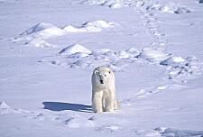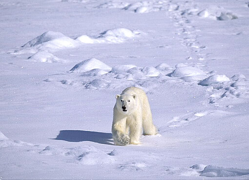 kommen sollten. 4. Tag Bis 9.00 Uhr am Morgen Nebel, dann Sonne, blauer Himmel und einzelne, sehr fotogene Wolken, und schon um 10.00 Uhr der erste Eisbär, allerdings leider zu weit entfernt für die Teleobjektive. Auf jeden Fall konnte man jetzt schon sehen, das die Landschaften um die Eisbären herum wesentlich attraktiver waren als in Churchill, der ‚Welthauptstadt der Eisbären‘, wo man immer Mühe hat, keine Reifenspuren der Tundrabuggys ins Bild zu bekommen.