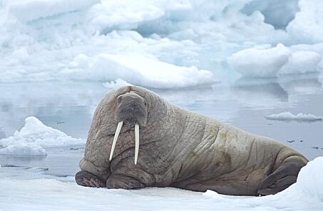 9. Tag Heute Vormittag war Walrosszeit. Etwa 40 Walrosse dösten am Strand, als wir mit den Zodiaks dort hin fuhren und an Land gingen. Wir machten es uns am Strand in etwa 100 Meter Entfernung in Wassernähe bequem, und einige Zeit später gingen 5-10 Walrosse ins Wasser und kamen zu uns geschwommen bis auf wenige Meter Entfernung. Anscheinend hatten sie noch nie oder kaum Menschen gesehen und wollten sich die mal anschauen. Etwa zwei Stunden lang fotografierten wir sie mit ihren beachtlich Stoßzähnen, wenn sie vor uns auftauchten. Auf dem Weg zu den nachmittäglichen Eisbären im Packeis hielt Rinie Van Meurs einen Diavortrag über Grönland.