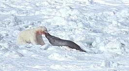 6. Tag Der Vormittag brachte eine spiegelglatte See mit wundervollen Reflektionen der treibenden Eisfelder, die sehr schön aussahen im Weitwinkelzoom mit einem Polfilter davor. Viermal ließen sich Bartrobben auf Eisfeldern fotografieren, manche sogar mit einem Spiegelbild in der glatten See. Der Nachmittag brachte das Aktion-Wildlife-Highlight der Reise: Ein Eisbär zog eine soeben erbeutete Bartrobbe aus dem Wasser und zog sie mit einer blutigen Spur etwa zwanzig Meter über das Eis. Dann fing er an zu fressen und bald war der Schnee blutgetränkt und auch der Kopf und Hals des Eisbären waren rot vom Blut der Robbe. Das gab echte Bilder aus dem wirklichen Leben, die aber sicher nicht sehr erfolgreich sein werden, denn so viel echtes Leben wollen die wenigsten Zeitschriften-Redaktionen veröffentlichen. Als Höhepunkt kam dann eine Stunde später noch ein zweiter Eisbär dazu, und der erste gestattete ihm etwa 15 Minuten lang mit von der Robbe zu fressen, um ihn dann zu verjagen. Der erste Eisbär fraß dann sage und schreibe über 6 Stunden an der Robbe in formatfüllender Entfernung für ein 500 mm Objektiv ohne Konverter. Also reichlich Zeit für jeden, nach Herzenslust blutige Bilder aus dem wirklichen Leben zu machen. Dies ist auch der große Spaßfaktor der digitalen Fotografie: Man fotografiert sensationelle Bilder von Eisbären die eine erbeutete Robbe verzehren, und kann sich eine Stunde später in der Bar des Schiffes die Bilder auf dem Labtop ansehen, sie ausdrucken und die Ergebnisse mit allen an Bord teilen. Auf Film fotografiert dauert es Wochen bis man weiß, was man fotografiert hat, wie man es fotografiert hat, und ob alles technisch und gestalterisch in Ordnung ist.