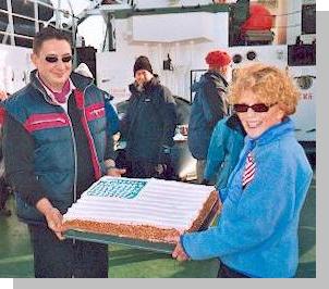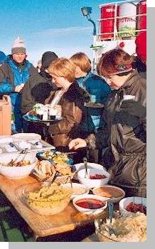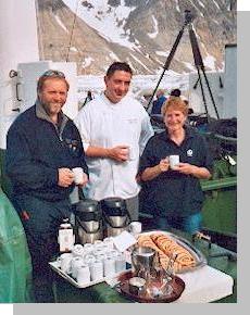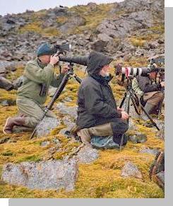 Sensia -100 Velvia -100 13. Tag Nach dem Frühstück sollte es mit den Zodiak-Schlauchbooten an Land gehen, um Rentiere, Füchse, Raubmöwen, Seeschwalben, Blumen und Flechten zu fotografieren. Nicht zu vergessen die tolle Landschaft. Durch einen Wettereinbruch war leider plötzlich die See so rauh, der Wind so streng, die Temperatur so niedrig und die Sicht so schlecht, daß dieser Trip verschoben wurde, und wir vor Anker warteten, daß am Nachmittag vielleicht die Bedingungen besser würden. In der Zwischenzeit sprach Dr. Wayne Lynch über Nahfotografie. Das Wetter besserte sich aber nicht, und so fiel unser letzter Fototag leider ins Wasser. Kismet.. 34 Naturfotografen an Bord arbeiteten mit analogen Kameras (22 mit Nikon und 12 mit Canon), 8 arbeiteten mit digitalen Kameras von Nikon oder Canon. Fünf davon hatten einen Labtop an Bord (einer auch einen Drucker). 3 Teilnehmerinnen hatten kleine, digitale Filmkameras. An Objektiven gab es ein 4.0/600 mm, etwa zwanzig 4.0/500 mm und ebenfalls etwa zwanzig hatten eines der relativ neuen 80/100 – 400 mm Zoomobjektive.