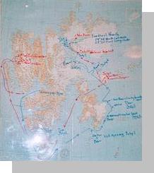 5. Tag Die See meinte es gut mit uns, und wir hatten das, was man gemeinhin ‚Ententeich‘ nennt. Gegen 9.30 Uhr erreichten wir ‚Bärenland‘, eine Gegend auf Spitzbergen, wo sich zwischen Eisschollen und Schnee besonders gerne etliche der 2.000 Eisbären von Spitzbergen aufhalten, und das nicht allzu weit entfernt ist von den Gebieten, wo die Bärinnen in Schneehöhlen ihre Jungen zur Welt bringen. Der Vormittag brachte schöne Eisfelder und 3 einzelne Walrosse auf Eisschollen. Der Nachmittag brachte noch ein Walross auf der Eisscholle, einen im Meer schwimmenden Eisbären und Regen.. Der späte Regen wurde von Joe Van Os für einen Diavortrag über die richtige Belichtung von Motiven genutzt, die heller sind als der mittlere Grauwert. Nach dem Abendessen tauchte dann auf den Eisschollen noch ein freundlicher Eisbär auf, der sich tatsächlich 1 ½ Stunden lang vom Schiff aus fotografieren ließ und bei dem um 22.10 Uhr der Belichtungsmesser bei Blende 4.0 noch 1/320 sek. anzeigte beim 100 ISO-Film. Das ist der Vorteil, wenn es so nahe am Nordpol (nur 600 Meilen entfernt) im Sommer 24 Stunden am Tag nicht dunkel wird.